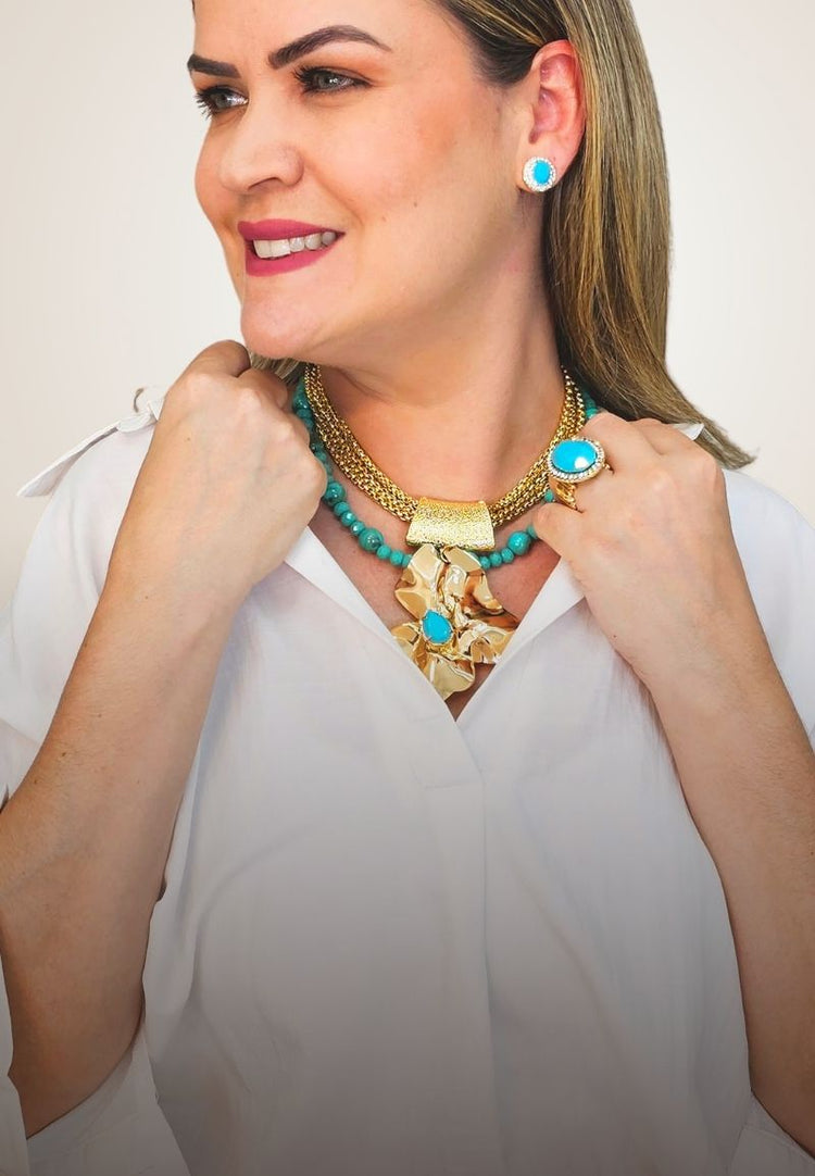 Colar Hortênsia com pedras azul turquesa pingente de flor e venezianas douradas